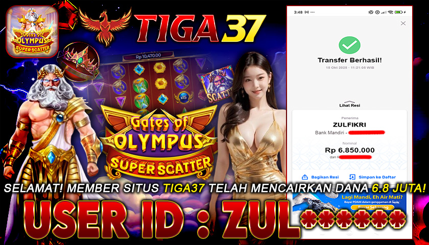 Kabar kemenangan datang dari Tiga37, di mana salah satu member dengan ID : ZUL***** sukses meraih jackpot Rp 6.800.000 dalam permainan Gates of Olympus SUPER SC. Proses pencairan berlangsung cepat dan terbukti lunas tanpa kendala, menegaskan reputasi Tiga37 sebagai platform terpercaya yang selalu menepati janji pembayaran untuk setiap kemenangan membernya.