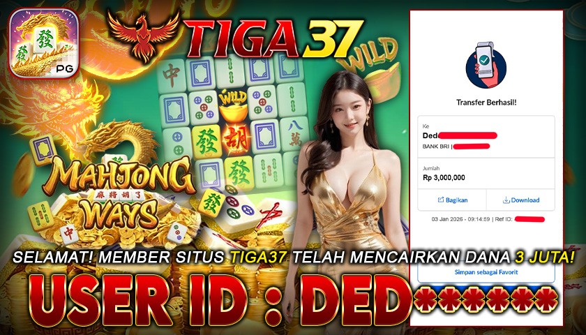 Kabar kemenangan datang dari Tiga37, di mana salah satu member dengan ID : DED***** sukses meraih jackpot Rp 3.000.000 dalam permainan Mahjong Ways. Proses pencairan berlangsung cepat dan terbukti lunas tanpa kendala, menegaskan reputasi Tiga37 sebagai platform terpercaya yang selalu menepati janji pembayaran untuk setiap kemenangan membernya.