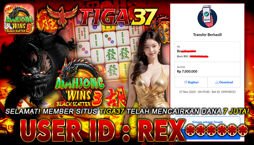 Kabar kemenangan datang dari Tiga37, di mana salah satu member dengan ID : REX***** sukses meraih jackpot Rp 7.000.000 dalam permainan Mahjong Wins: Black Scatter 3. Proses pencairan berlangsung cepat dan terbukti lunas tanpa kendala, menegaskan reputasi Tiga37 sebagai platform terpercaya yang selalu menepati janji pembayaran untuk setiap kemenangan membernya.