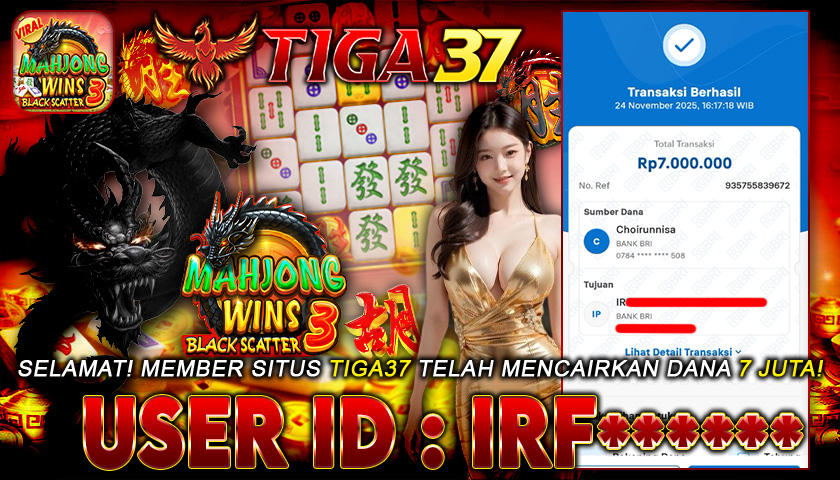 Kabar kemenangan datang dari Tiga37, di mana salah satu member dengan ID : IRF***** sukses meraih jackpot Rp 7.000.000 dalam permainan Mahjong Wins: Black Scatter 3. Proses pencairan berlangsung cepat dan terbukti lunas tanpa kendala, menegaskan reputasi Tiga37 sebagai platform terpercaya yang selalu menepati janji pembayaran untuk setiap kemenangan membernya.