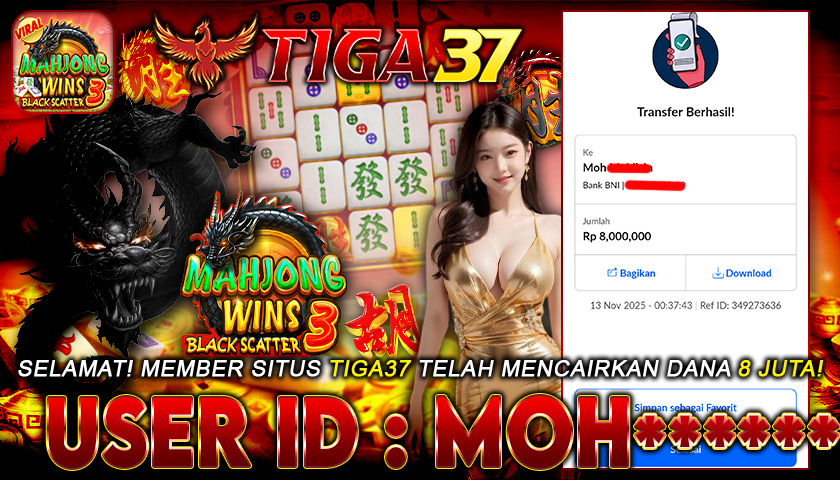 Kabar kemenangan datang dari Tiga37, di mana salah satu member dengan ID : MOH***** sukses meraih jackpot Rp 8.000.000 dalam permainan Mahjong Wins: Black Scatter 3. Proses pencairan berlangsung cepat dan terbukti lunas tanpa kendala, menegaskan reputasi Tiga37 sebagai platform terpercaya yang selalu menepati janji pembayaran untuk setiap kemenangan membernya.
